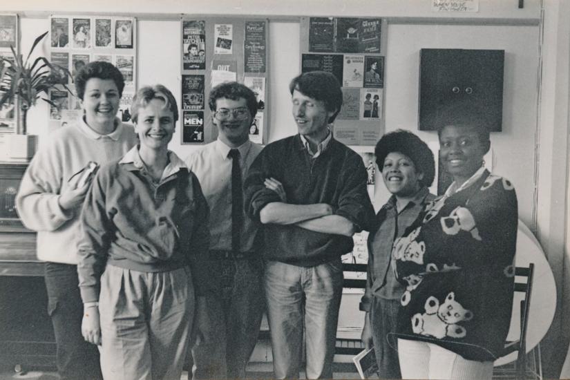 A photo of the Greenwich Lesbian and Gay Centre management committee from 1987 to 1988, which included Joanne Hill, Alison Hastwick, Derek St Louis, Richard Fabian, Steve McMillan, Viv Betz and Sonia Harris. This image was scanned as part of the Our History project, which archived, recorded and preserved our LGBT heritage in 2019/20.