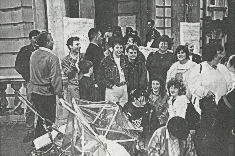 A photo of members of the Greenwich Lesbian and Gay Centre protesting council funding cuts outside Greenwich Town Hall, asking council leader Quentin Marsh to reinstate a £8,000 shortfall on 15th May 1991. This image was scanned as part of the Our History project, which archived, recorded and preserved our LGBT heritage in 2019/20.