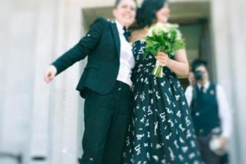 Mascara, moustache, suit and stilettos, Sarah broke a heel on the way to our wedding. Breathless in brogues, she rushed back in, clasped my hands and welled up during our vows. My wife; my wusband. This was 2012, the first queer nuptials in our community and we danced till dawn. A few days later a guest recounted an uncomfortable interaction she’d overheard, when another guest asked invasive questions to a couple of friends who are both trans guys: “Have you had the surgery?” “How do you have sex?” I was horrified that this happened at our wedding.