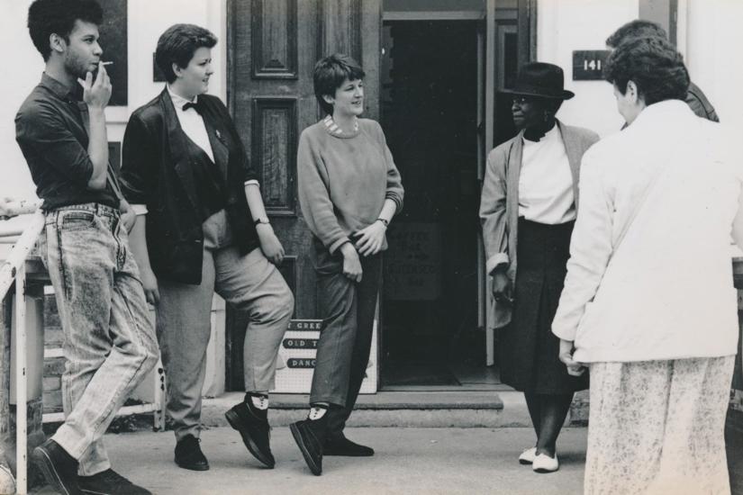 A photo from the Grand Tea Dance and AGM at the Greenwich Lesbian and Gay Centre in 1988. This photo shows Keith Trotman, Joanne Hill, Maggie Honey and Sonia Harris at West Greenwich House. This image was scanned as part of the Our History project, which archived, recorded and preserved our LGBT heritage in 2019/20.