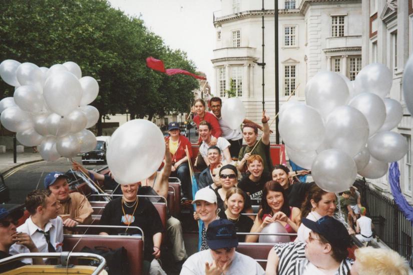 Young people with balloons on the top deck of The Metro Centre bus at London Pride in 2001. This image was scanned as part of the Our History project, which archived, recorded and preserved our LGBT heritage in 2019/20.